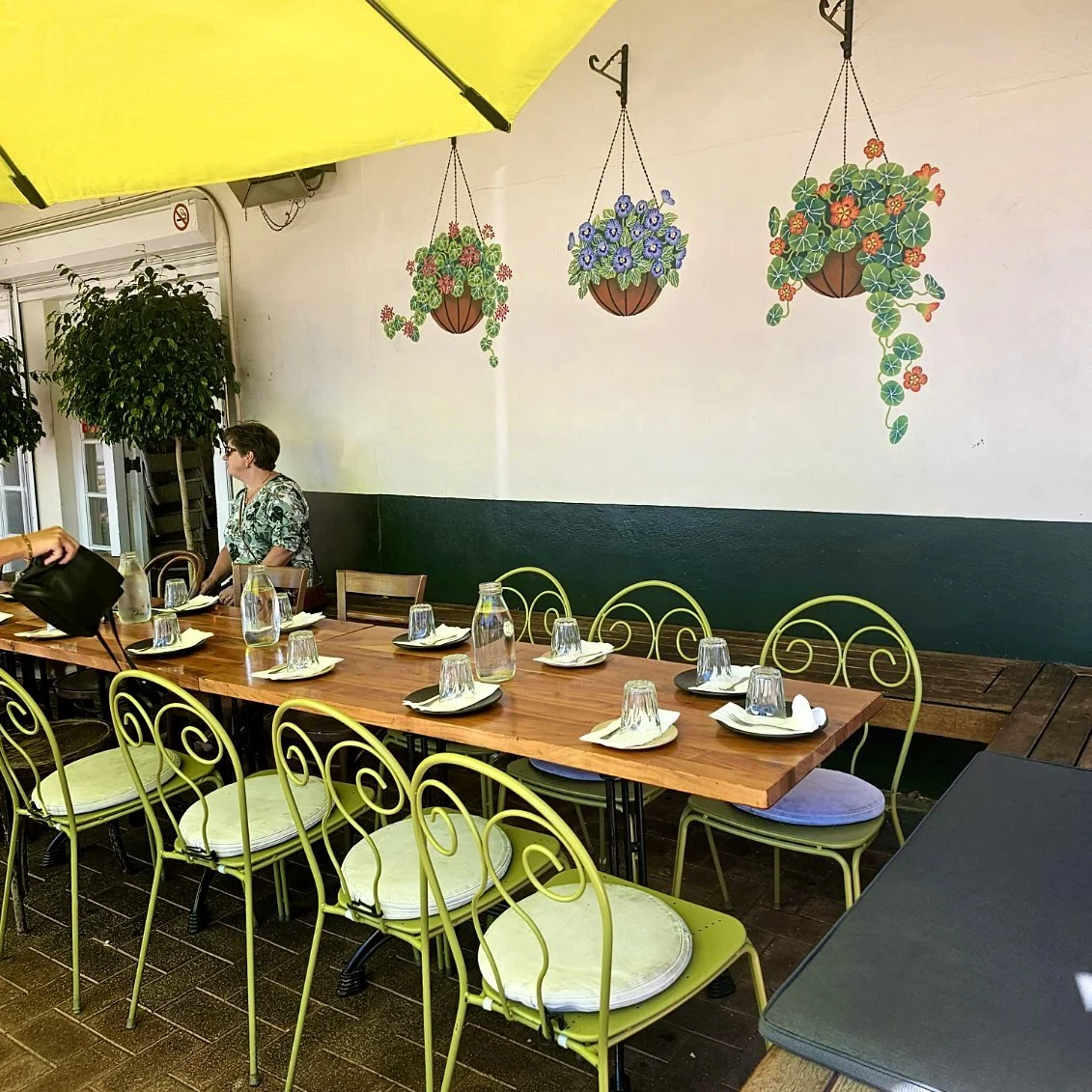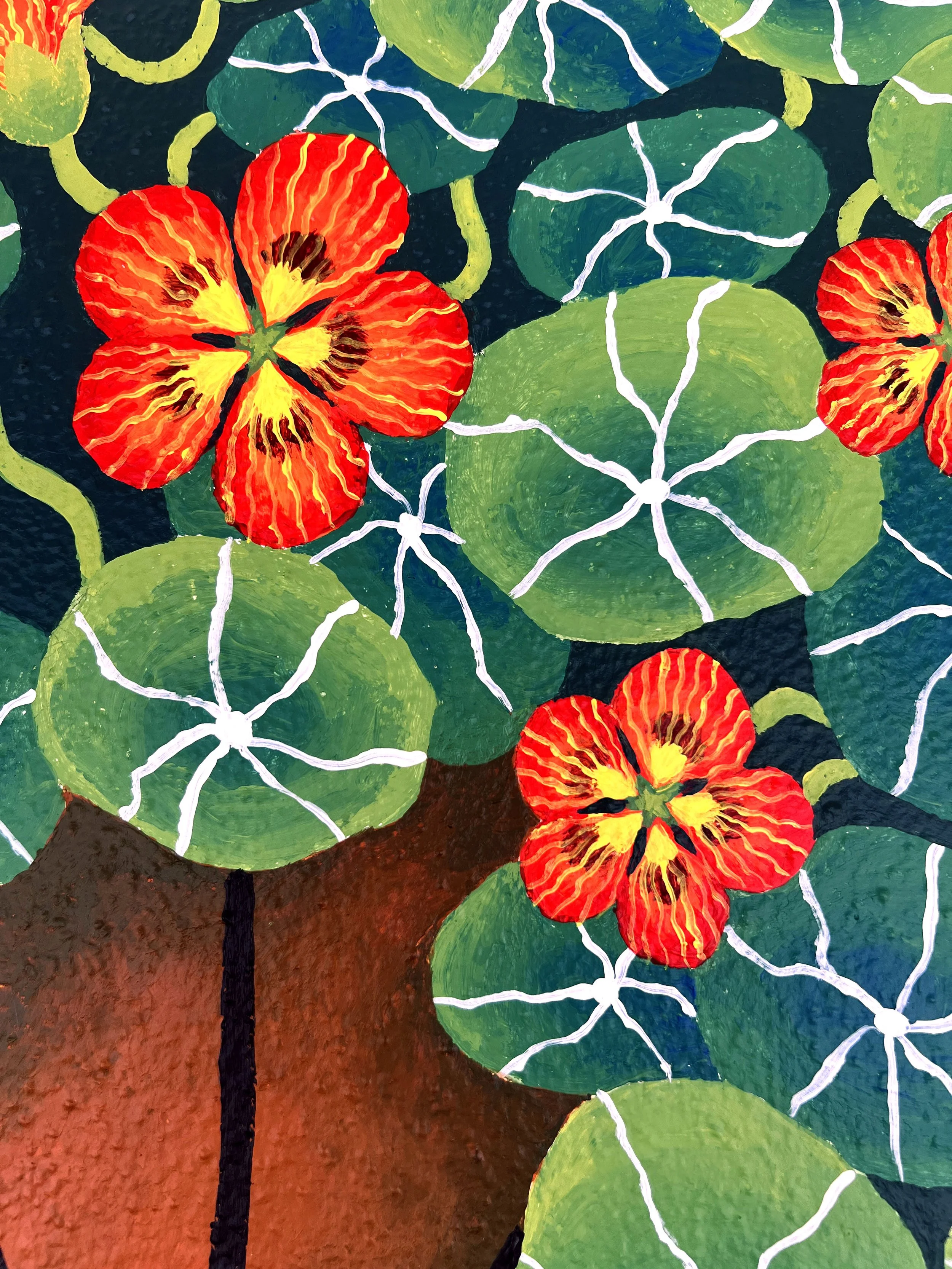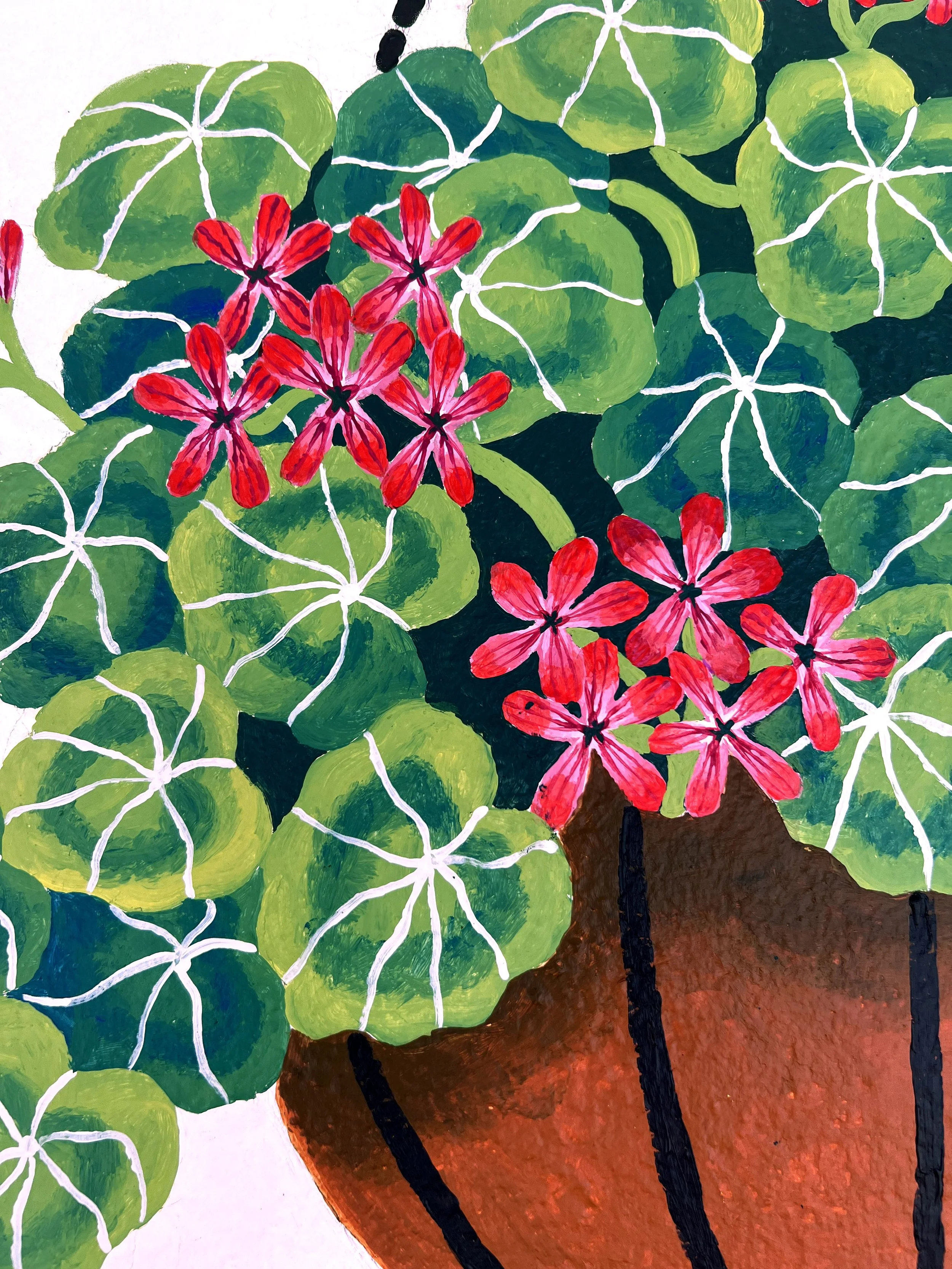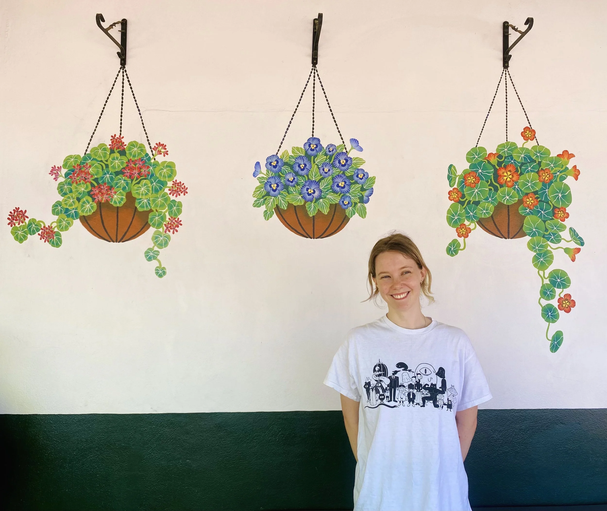 An outdoor mural I painted for George Street Café and Patisserie. The project involved designing three baskets of flowers for the three hooks placed outside the café. I chose to paint geraniums, pansies and nasturtiums.