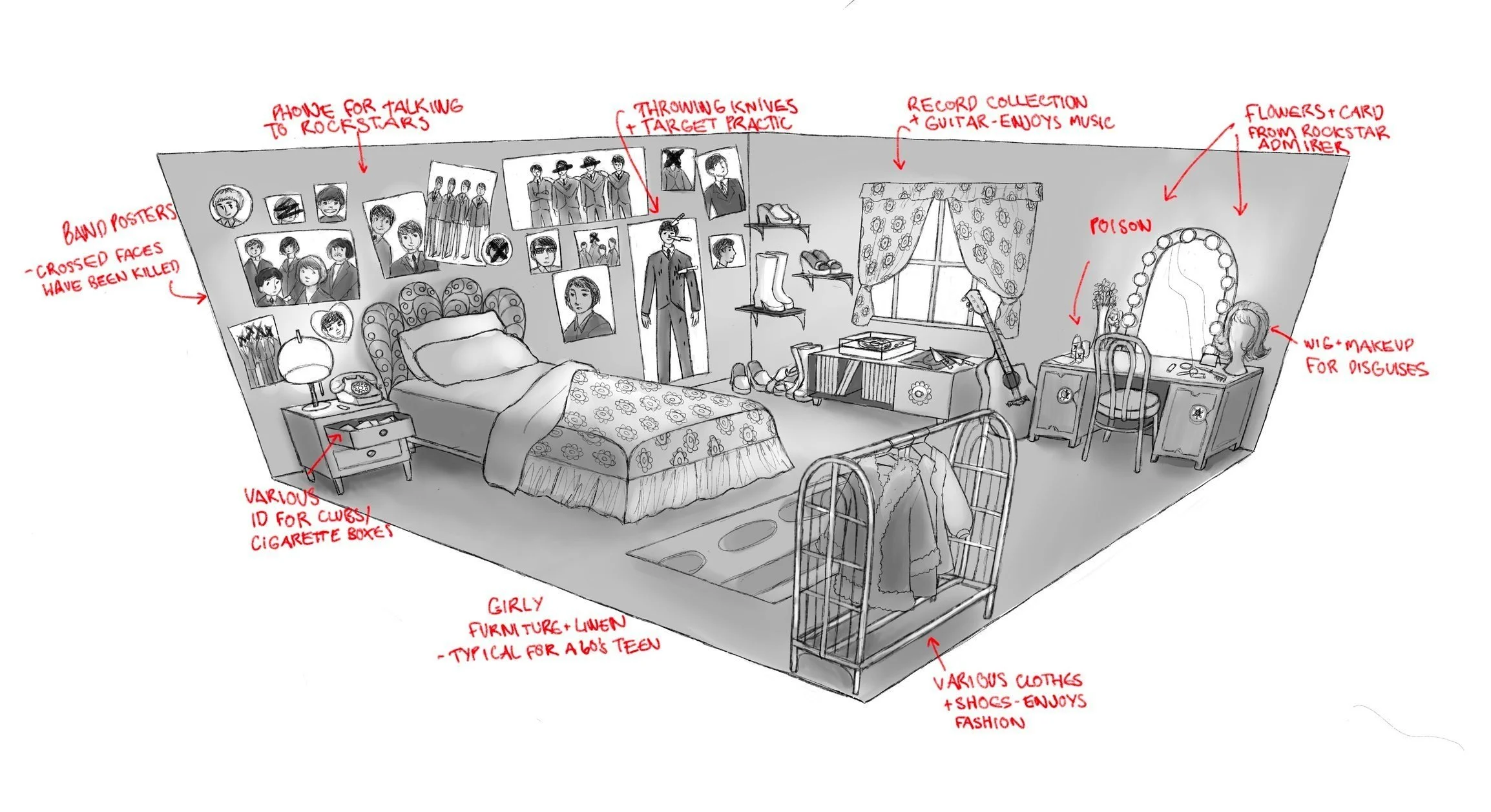This project’s prompts were to create a teen character and their bedroom from a particular time period. They also have an secret identity or hobby.
