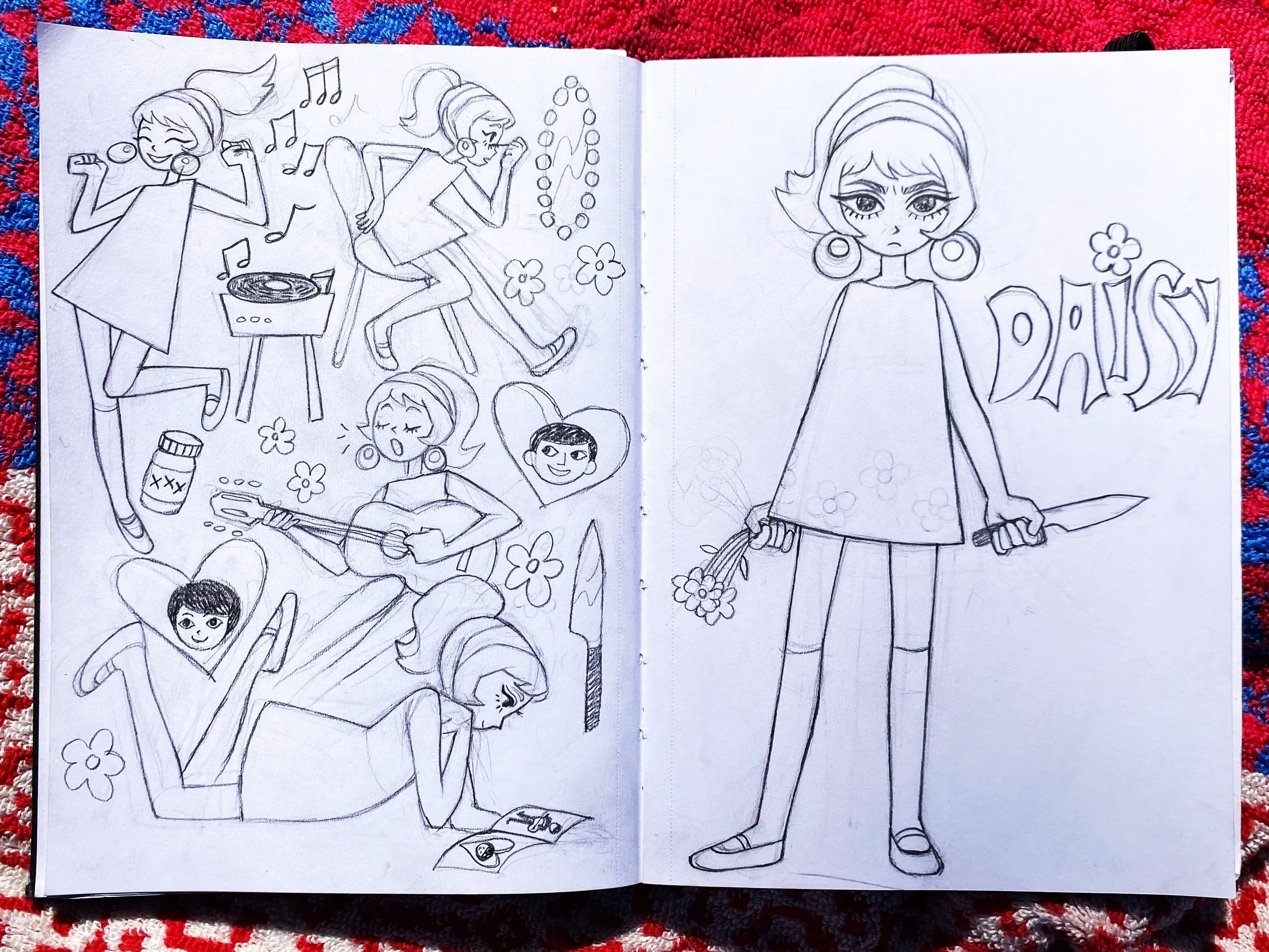 The outcome of this set of prompts is Daisy, a groupie assassin from the 60s. She is hired to target pop music idols by honeypotting then killing them.