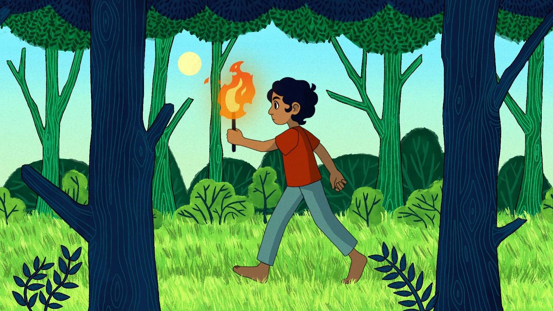 The theme of Love in Adversity brought to mind the journey of the soul. The love it possesses is a powerful force that drives the soul toward its Creator. I have made an animation of a figure travelling through a forest, and as they forge on and night falls, the fire of the love they hold burns brighter.